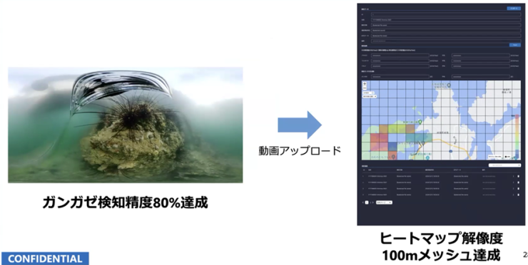 このシステムは、2024年度の総務省 地域デジタル基盤活用推進事業において、長崎県五島市で実証された。本実証で開発されたシステムを用いて、再生した藻場の食害状況を監視できるようになった。 (図2参照)その“見える化”が、地域の理解と対策を生む材料となり、課題解決に向けた、データに基づく合意形成を後押ししている。